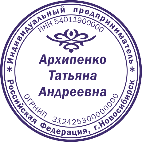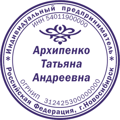 Образец клише печати индивидуального предпринимателя. Клише - это часть печати с зеркальным отображением рисунка. Для полноценного использования печати клише необходимо наклеить на оснастку.
